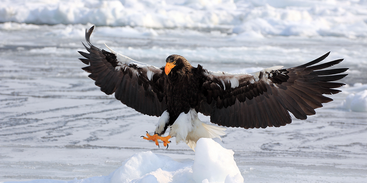 世界自然遺産・知床の東側に位置する羅臼(らうす)の沖合は、世界屈指の野鳥撮影の聖地として知られています。シベリアから南下してきた流氷が根室海峡を埋め尽くし、その氷上を休息地として、絶滅危惧種であるオオワシやオジロワシが数百羽も集まります。